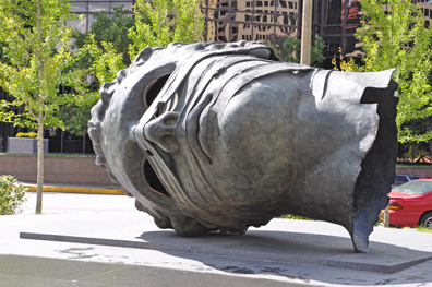 | Below is something called art - a giant hollow head. The dark color on the ground in front of the head is actually water flowing up from the crack just in front of the head and then flowing down to the edge of the circle. | |