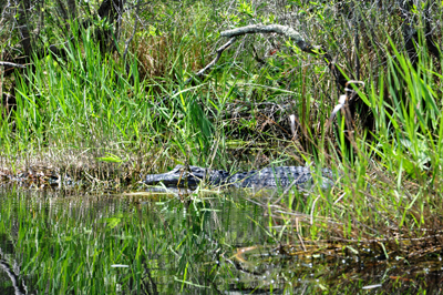 | When the boat got too close to this alligator, the alligator jumped into the water. It was amazing how fast it moved, and all Karen Duquette got on camera was the splash as it jumped into the water. | |