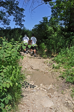 Below: Lee Duquette and his grandson, Alex Jones, walking down to get below the Creek Road Covered Bridge |