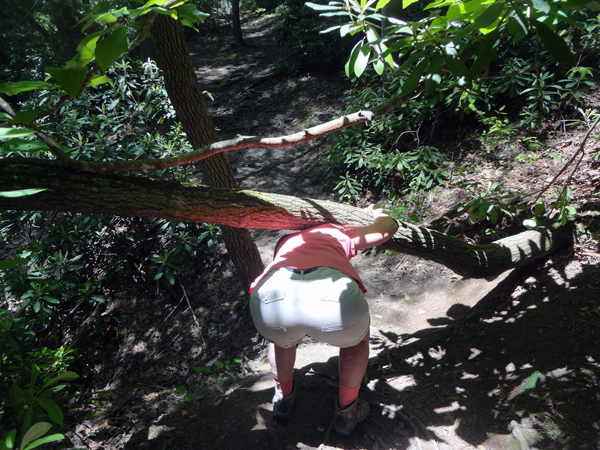 Below: Karen Duquette ducked under the tree that was across the trail - When she got to the other side of the tree, she hung on to the tree until she managed to stand up straight again, and realized that Lee took an unflattering photo of her booty. |