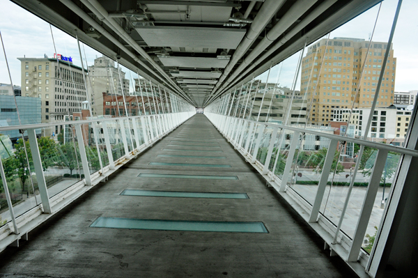bridge that spans River Drive (Highway 67) in downtown Davenport, Iowa.