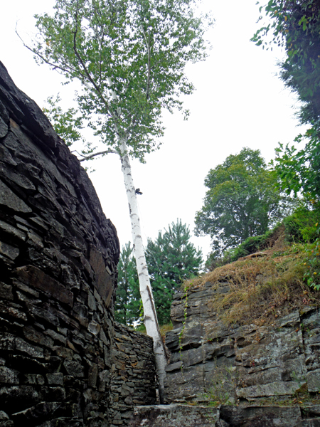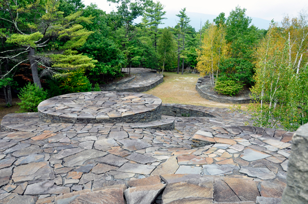 He quarried additional stone to build ramps and walkways to lead to the individual works, doing all the work by hand, and using the traditional hand tools that had been used by the local quarrymen before him. In 1960, as the ramp work expanded, Fite realized that the 1.5-ton statue, “Flame,” which occupied the central pedestal, had become too small for the scale to which his work had grown, and he replaced it with a 9-ton bluestone pillar which he had found in a nearby streambed. He removed “Flame” and its base, and continued to remove stone until he had formed a crater four feet deep in the spot where the monolith was to stand. He placed the stone so that it rested horizontally, with the tapered end over the hole. Using guy wires attached to a winch on the back of a pickup truck, Fite began the laborious process of raising the stone a few inches at a time, then propping it up with a crib of heavy wooden blocks. He continued this process until gravity took over, and the stone slid down into the hole, coming to rest at a 45 degree angle.