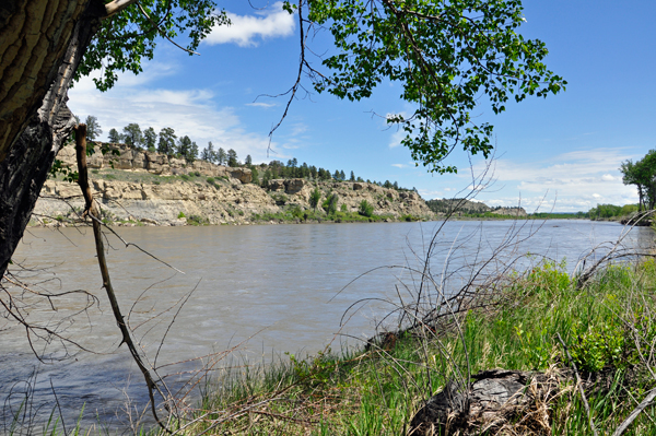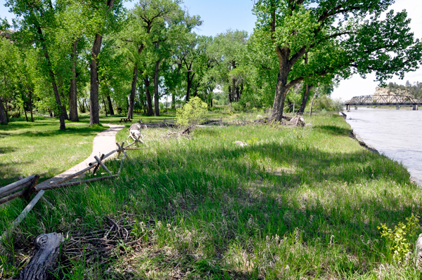 Below: A view of the top observation point at Pompeys Pillar, and a path for walking further alongside the Yellowstone River. |