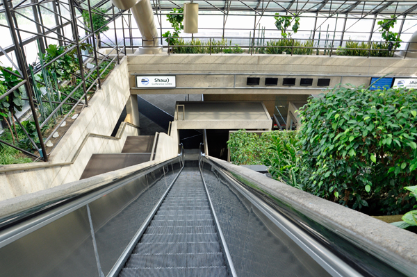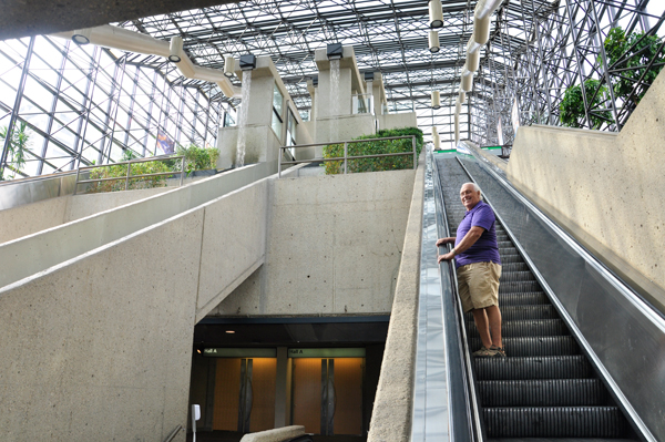 Below: Lee Duquette on the escalator inside the Shaw Convention Center |