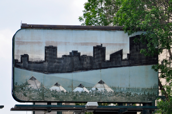 While driving across a bridge into Edmonton, Karen Duquette noticed the top of a pyramid made of silver balls, so she quickly snapped a picture. She never did find out the purpose of this silver ball pyramid. |