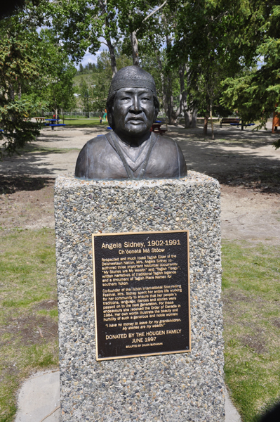 by the Healing Totem Pole and the river in downtown Whitehorse.
