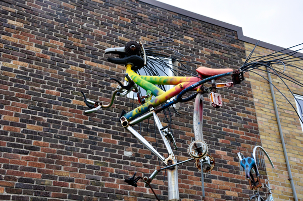 Below: Sculptures in a bicycle parking lot in downtown Forest City
