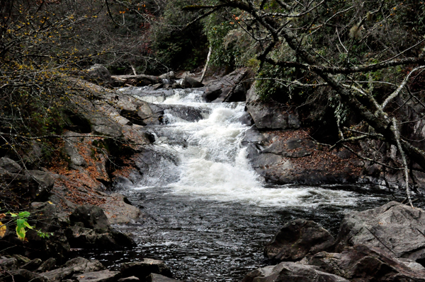Drift Falls flows on the Horsepasture River in the Jocassee Gorge. The falls is an 80-foot slide over bedrock to a deep pool, and is a part of a series of waterfalls along a 1,200-foot drop along the course of the river over a 2.5 mile stretch.In the past, large numbers of visitors to the falls would cause traffic problems along North Carolina Highway 281 as they gathered at the falls to swim in the pool. Thrill seekers would use the falls as a natural waterslide, which is how the falls got its nickname of "Bust-Yer-Butt Falls.” |