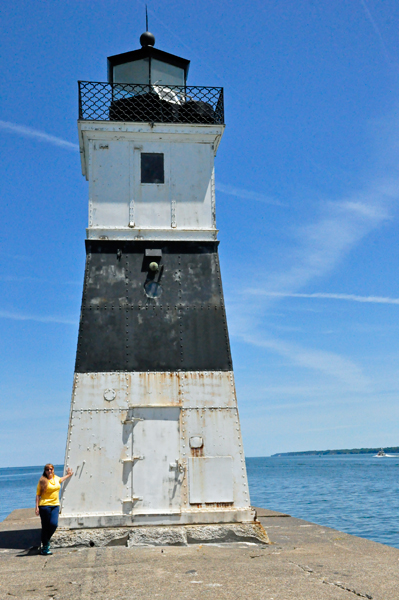 Leaving Presque Lighthouse, the two RV Gypsies went to The North Pier Lighthouse, known as The North Pier Light. It is located at the end of Presque Isle. It takes about 20 minutes to drive to the lighthouse from the park's entrance. The lighthouse watches over the entrance to Presque Isle Bay. The term Presque means almost an island in the French language.The black and white tower has been guarding the journeys of many mariners since the early 1800s. It was relocated to its present location in 1940 and was fitted with several heavy steel plates. It was listed on the National Landmark in 1967.It is only 34-feet-tall; the shortest of the lighthouses in Erie PA. It juts out nearly 600 feet from the shores of Presque Isle. It is a popular spot with fishermen and a great spot to watch the boats passing through the narrow channel. The keepers's house is at the Coast Guard Station near the end of the pier. |