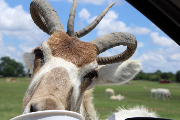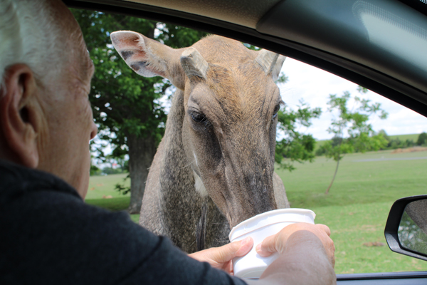 Below: Even with Karen Duquette's window closed, animals pushed their faces against her window. Karen was so glad her window was closed. Lee Duquette was jiggling his bucket out his window to get the animals to go to his side of the car. |