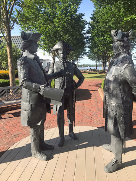 Below: "According to York County's social media pages, the statue of Marquis de Lafayette had to be removed from his place at Riverwalk Landing in Yorktown after his head fell off. In a Facebook comment, the county said it was unclear how the head became detached. Artist Cyd Player was able to perform some light maintenance and put the good head back on his shoulders. Public Works reinstalled the statue alongside the statues of George Washington and Francois Joseph Paul de Grass."