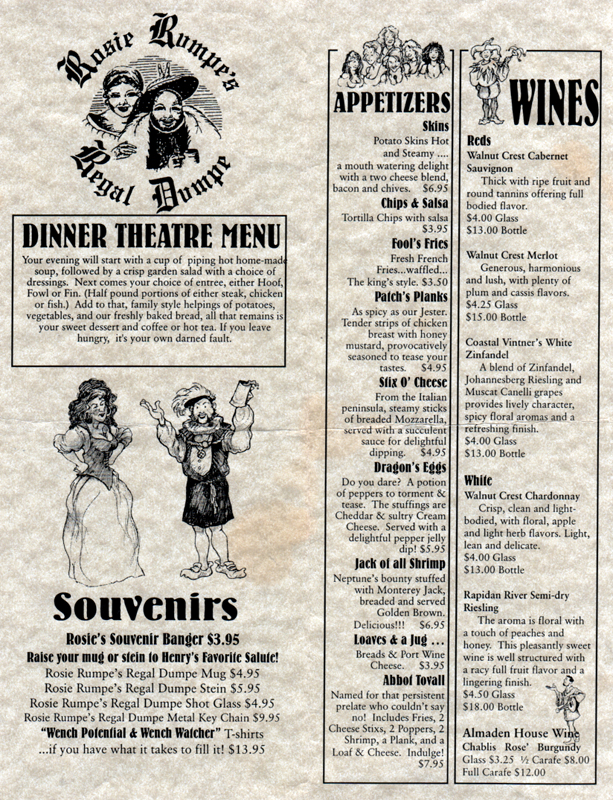 Because of Lee Duquette's participation in the show as "Knave Lee", he was given a coupon to return free within 6 months. Unfortunately, Lee and Karen Duquette were never able in the area again, so were unable to use the coupon shown below. Rumor has it that this place has closed down. |