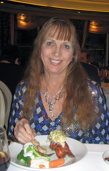 Below: Karen Duquette and friends in a casual food area on the ship. |