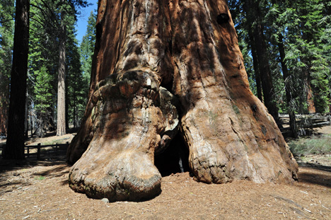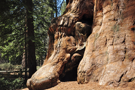 | The Tennessee Tree shows resilience to fire damage, continuing to thrive in spite of deep fire scars. The living tissue or cambium layer of a sequoia lies just under its bark. As long as some of this thin, living tissue connects the leaves above with the roots below, the tree will continue to live. If undisturbed by people, or more fire, this living layer will eventually heal the fire scars seen on this tree. | |