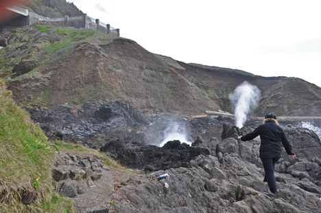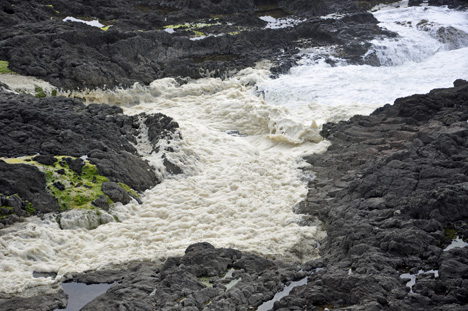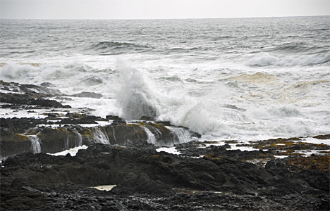 | Below: After the waves come into the inlet, they crash against the rocks, then go behind the rocks to the Spouting Horn. | |