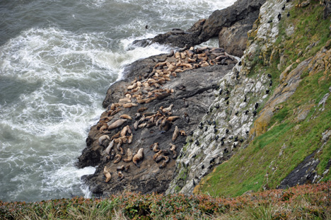 | Below: Not only were there lots of sea lions making lots of noise, but lots of birds (the dark specks) and lots of bird poop (the white specks) LOL | |