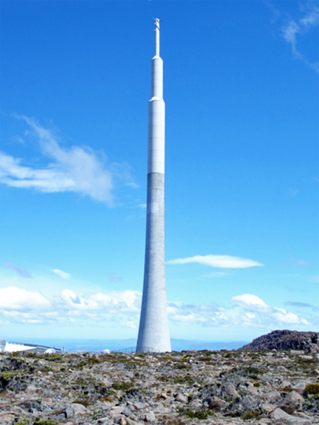 Below: The 4,170-foot (1,270-meter) peak of Mt. Wellington is one of Hobart’s most famous landmarks. The transmission tower perched atop Mount Wellington has a sharp structure punctuating an otherwise natural landscape. It has been looking over the city for more than 50 years, but little is known about the tower itself. |