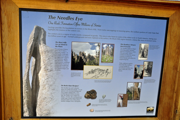 Below; As the two RV Gypsies drove around another corner, they saw a pullout area with a lot of cars parked. Lee Duquette stopped the truck and Karen Duquette got out to ask someone standing next to his parked car with the door open to close his car door so Lee could park in the only available parking space. Karen held up traffic, enabling Lee to park. They checked out the sign at the start of the trail in this majestic area and Lee decided that the trail was too long for them to hike, so they decided to just go a short way up the trail to take some amazing photos of the needles. |